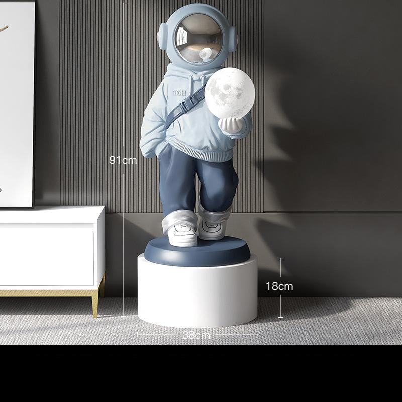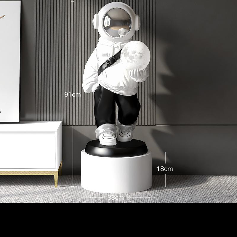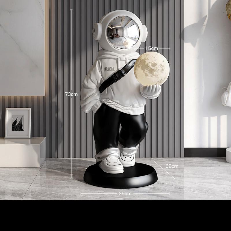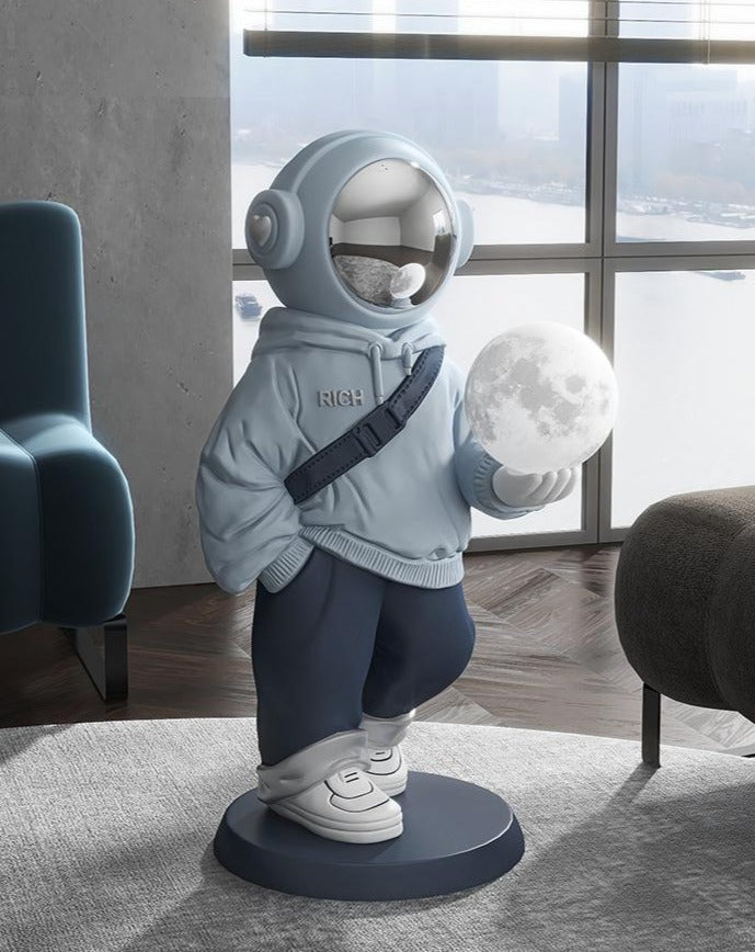 Add a lunar glow to your home with this X-Large Astronaut Floor Statue with Moon Lamp. The astronaut-inspired sculpture stands tall with an illuminated moon lamp providing a gentle, calming vibe. Let it be a beacon of light in a dark room.